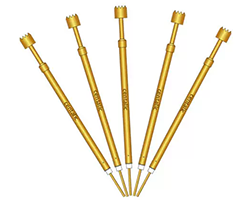 導通のON/OFFをプローブで行うことができるプローブ、フルストローク:5.0、定格ストローク:3.3、許容電流:17A@30s、10A@300s、固有抵抗:< 160mΩ、定格ストローク時スプリング圧:100gf、常時オープン、データシート、寸法単位:mm、表記価格:1販売単位