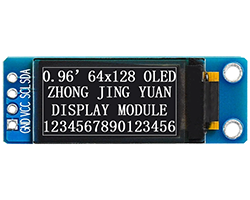 OLED表示器モジュール、白黒、0.96インチ、64 x 128、表示領域:10.86 x 21.74 mm、内蔵コントローラIC:SSD1312、信号インターフェース:I2C、接続インターフェース:2.54mmピッチスルーホール、動作電源:3.3〜5V、基板寸法:40 x 14.2 mm、表示色はバリエーションよりお選び頂けます、表記価格:1販売単位
