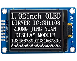 OLED表示器モジュール、白黒、1.92インチ、128 x 160、表示領域:28.908 x 39.34 mm、内蔵コントローラIC:SH1108、信号インターフェース:I2C/SPI(デフォルトはSPI)、接続インターフェース:2.54mmピッチスルーホール、動作電源:3.3V、基板寸法:60 x 37 mm、表記価格:1販売単位