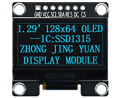OLED表示器モジュール、1.29インチ、128 x 64、表示領域:29.42 x 15.70 mm、内蔵コントローラIC:SSD1315、信号インターフェース:SPI/I2C(デフォルトはSPI)、接続インターフェース:2.54mmピッチスルーホール、動作電源:3.3V、基板寸法:33 x 32 mm、表記価格:1販売単位