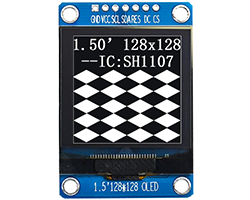 OLED表示器モジュール、白黒、1.5インチ、128 x 128、表示領域:26.855 x 26.855 mm、内蔵コントローラIC:SH1107、信号インターフェース:SPI/I2C(デフォルトはSPI)、接続インターフェース:2.54mmピッチスルーホール、動作電源:3.3V、基板寸法:49.3 x 34 mm、表記価格:1販売単位