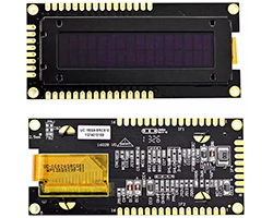 キャラクタOLED表示器モジュール、単色、2.26インチ、16 x 2、表示領域:56.22 x 11.52 mm、内蔵コントローラIC:SSD1311(US2066)、信号インターフェース:8ビットパラレル、接続インターフェース:2.54mmピッチスルーホール、動作電源:3.3Vと5Vの2モード、基板寸法:80 x 36 mm、表記価格:1販売単位