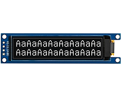 フルカラーOLED表示器モジュール、単色、2.26インチ、16 x 2、表示領域:56.22 x 11.52 mm、内蔵コントローラIC:KS0066、信号インターフェース:I2C、接続インターフェース:2.54mmピッチスルーホール、動作電源:3.3V、基板寸法:80 x 20.2 mm、表記価格:1販売単位