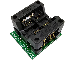 変換基板に実装済みICソケットOTS-16(20M)-1.27-01、変換先:2.54mmピッチ2x8ピンヘッダ(幅:)、適合チップパッケージ:デュアルSOP-8、適合チップ寸法(mm):P=1.27、WB=5.4、WL=、販売単位:1台、表記価格:1単位=1台