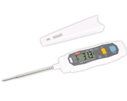 A61 is an IP65 rated thermometer with FDA certified stainless steel probe. It is equipped with a protective shell to prevent accidental skin puncture and burning. With its portable pen-like design, clear backlight display, and auto power off functions, A61 is a useful temperature measurement tool for cooking, refrigeration, heating, food processing and other applications.