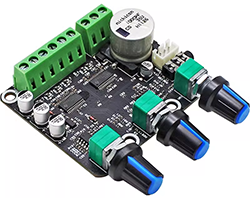 TPA3110D2を搭載した実装済みパワーアンプモジュール、最大出力:2x15W+30W、2.1ch、負荷:4〜8Ω、動作電圧範囲:8〜26VDC、7〜18VAC、正負両電源、基板寸法:67x57.5mm、詳細資料が付いていないので掲載情報だけでご利用いただける方にお勧め、表記価格:1