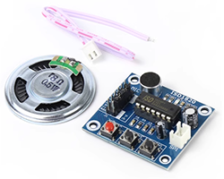 ISD1820を搭載した実装済み録音再生モジュール、制御インターフェース:2通り、(1)タクトスイッチx3、(2)マイコンI/O、オーディオ出力:0.5W 、動作電圧範囲:3〜5V、基板寸法:42.5x38mm、表記価格:1