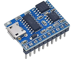 JQ8400を搭載したmp3プレーヤー、通信インターフェース:シリアルUART、データダウンロード:マイクロUSBコネクタ、オーディオ出力:8002、MAX 3W、4〜8Ω、動作電源:3.3〜5.2V、基板寸法:25x18mm、表記価格:1