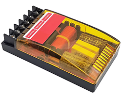 スピーカネットワーク、120W、低音と高音の2ウエイ、高音保護素子PCT、接続:B=BASE、T=TREBLE、ケース外形寸法:120x65x33mm、表記価格:1
