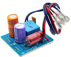 スピーカネットワーク、65W、低音と高音の2ウエイ、低音帯域の目安:120〜20000Hz、接続:B=BASE(低音)、T=TREBLE(高温)、基板寸法:46x45mm、表記価格:1
