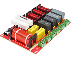 スピーカネットワーク、300W、低音(2ウエイ)・中音(2ウエイ)・高音の5ウエイ、接続:B=BASE(低音)、M=MEDIANT(中音)、T=TREBLE(高音)、基板寸法:163x105mm、表記価格:1