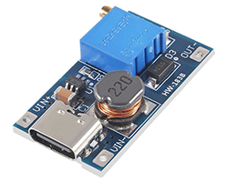 SX1308を搭載した昇圧モジュール、入力電圧範囲:2通り、(1)2〜24V、基板スルーホール、(2)5V、バスパワー、TYPE-CメスUSBコネクタ、出力電圧範囲:2〜28V、最大出力電流:MAX 2A、動作周波数:1.2MHz、電力変換効率:MAX 95%、基板寸法:30x17mm、表記価格:1